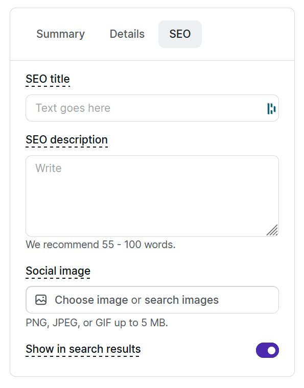 You can also specify the title, description, and image that is used by search engines when they present your blog post in search results (necessary for SEO - search engine optimization).